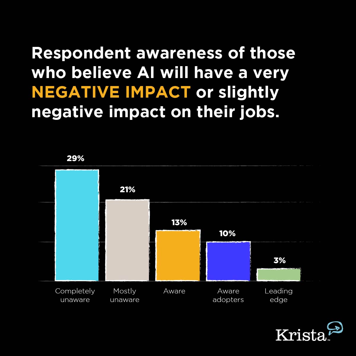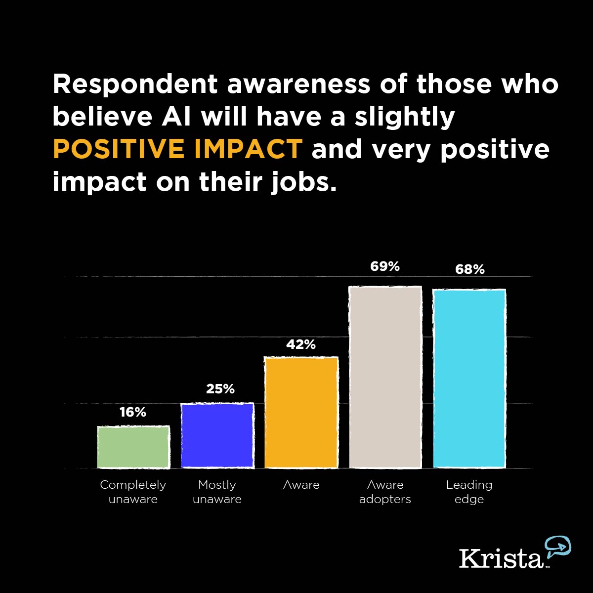 - Lower awareness of AI corresponded with greater concern about its impact on one’s job. Conversely, those who know more about AI are more positive about its potential impact on their job.