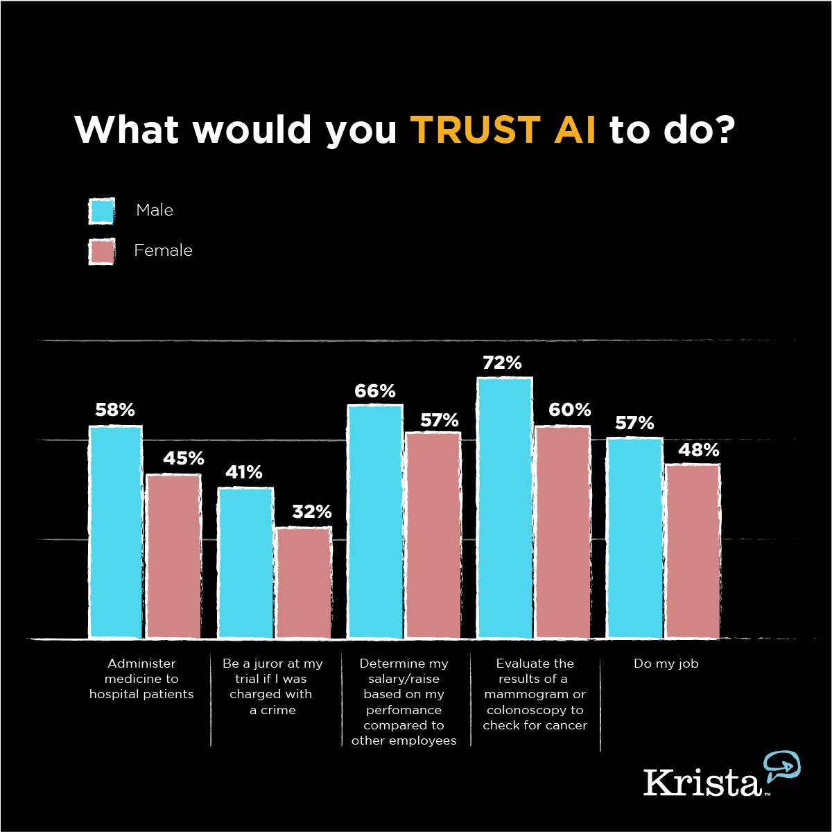 As you can see, whether life-threatening or not, most respondent answers reveal that Americans overall don’t trust AI to do tasks and make decisions that would remove their human control over material yet everyday situations. In most scenarios, men and women align with what they would and would not want AI to do. Yet, in some cases, men tended to be more open than women to AI performing a wider range of tasks.