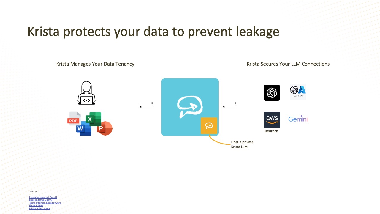Krista is a comprehensive solution to address the inherent privacy and security risks of using LLMs in your workflows. Krista isolates your employees from having direct LLM access and acts as a secure gateway between your users and LLMs to safeguard your information.