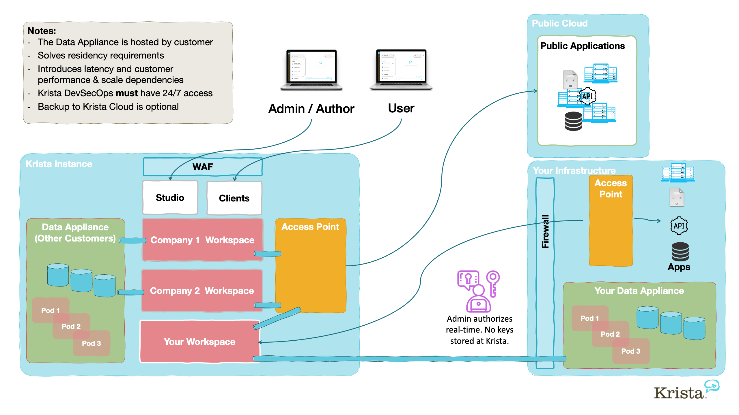 This model prioritizes data sovereignty. The Instance runs in the Krista Public Cloud. You host the Data Appliance in your own data center. Data stays on your premises to meet regulatory needs. You retain full physical control over your information while leveraging cloud compute for logic.