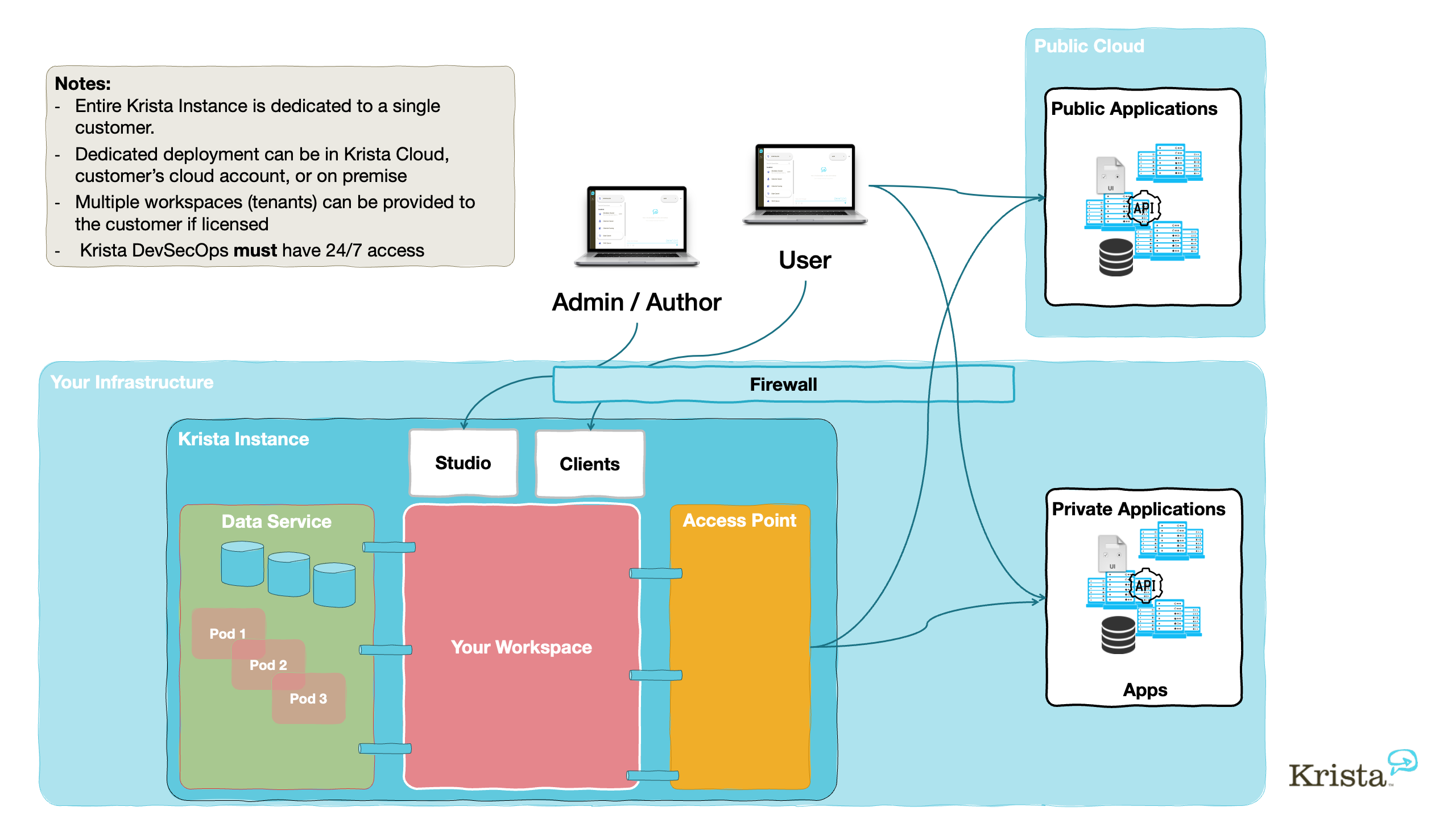 services to host multiple workspaces and orchestrates interactions with appropriate data appliances and access points. Krista DevSecOps automates and manages all deployments, updates, and migrations. We deploy the Instance into a Kubernetes-based Infrastructure.