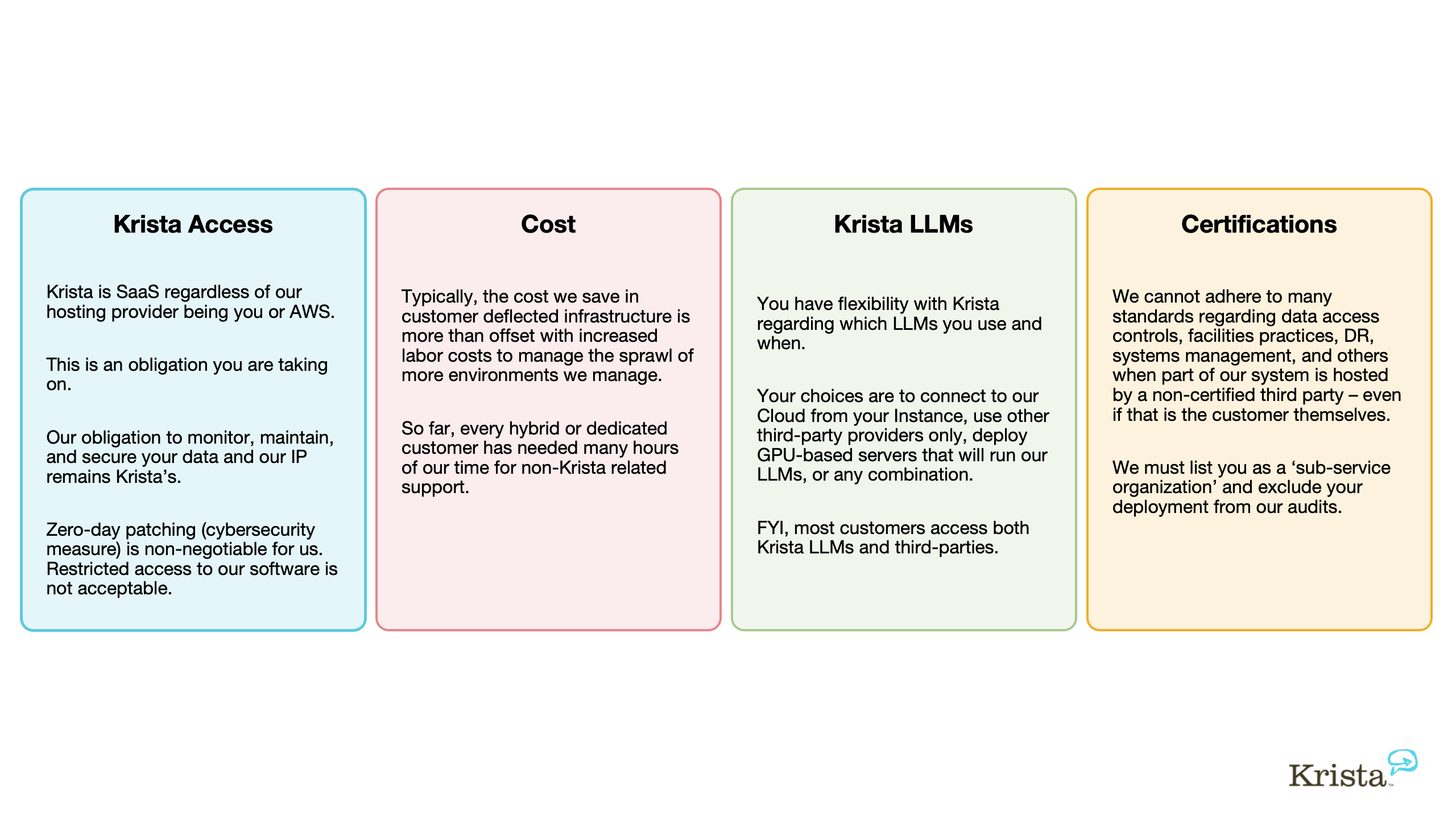 Krista operates as SaaS in every model. This ensures reliability and continuous security updates regardless of where the infrastructure lives.