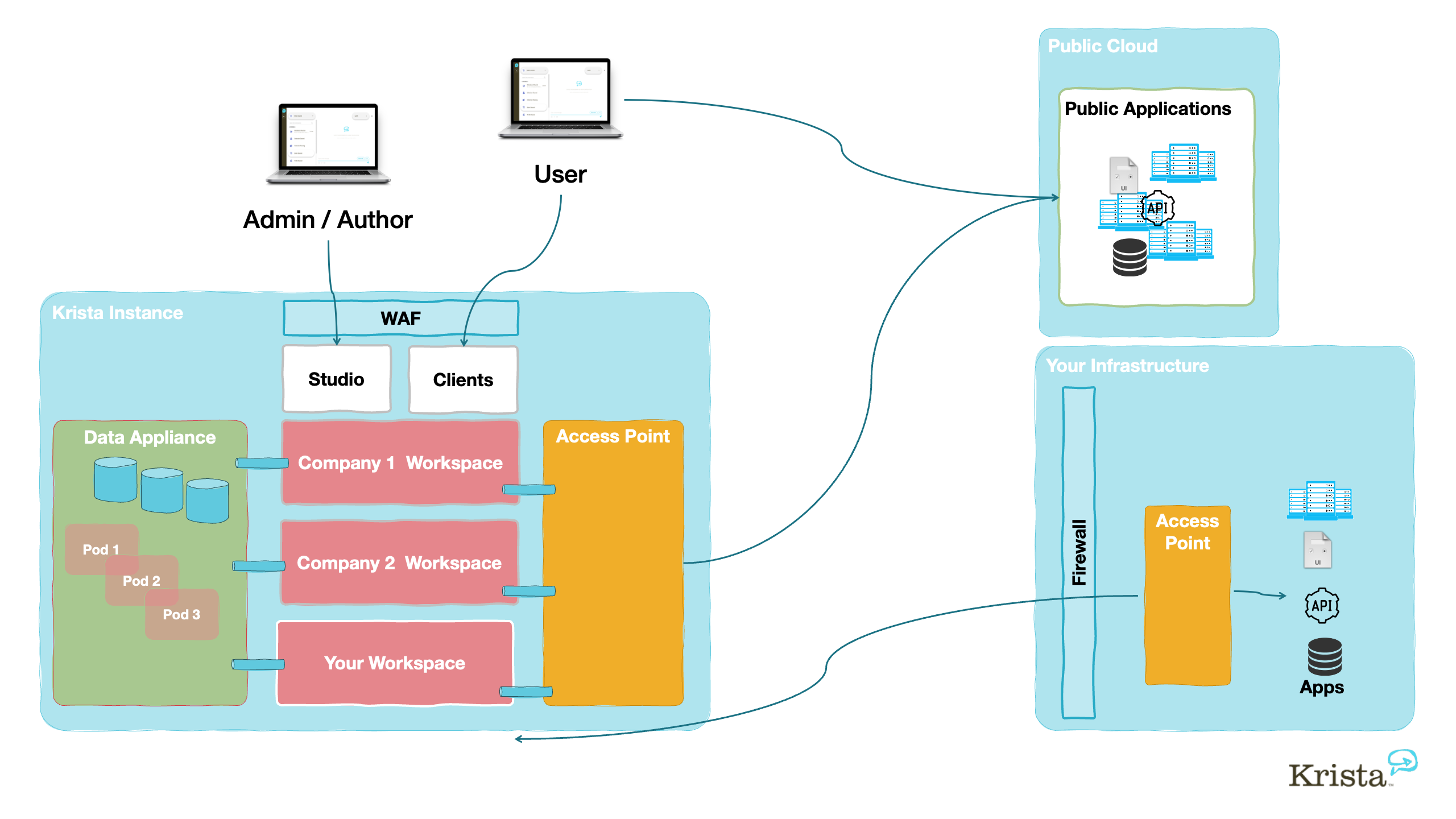 This acts as the secure bridge. It is a component in Krista that is responsible for hosting extensions, enabling Krista connectivity to customer applications and data. We deliver this as Kubernetes or Docker components that can be hosted in a variety of ways. Many Access Points may be used in a single deployment. Every Krista Instance has at least one Access Point deployed.