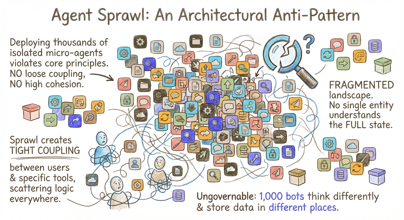 Deploying thousands of isolated micro-agents violates the core principles of software architecture. Good design promotes loose coupling and high cohesion. Sprawl creates tight coupling between users and specific tools while scattering logic across the enterprise. It creates a fragmented landscape in which no single entity understands the full state of the business. You cannot govern 1,000 bots that all think differently and store data in different places.